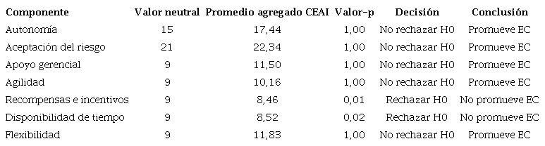 Para determinar qué tanto los gerentes de las organizaciones grandes en Costa Rica percibían el ambiente organizacional como promovedor del EC, así como cada componente, se establecieron las siguientes hipótesis, partiendo de que percibían un clima propicio para el EC: