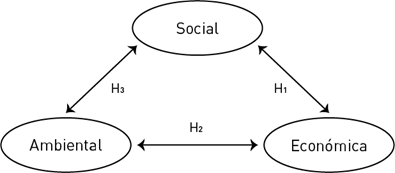 Para el desarrollo y formulación de las hipótesis en esta investigación se tomó en cuenta la correlación existente a nivel teórico que se forma entre las dimensiones económica, social y ambiental (Abad et al., 2017), la cual permite la estructuración de las métricas conocidas como socioeconómicas, socioambientales y de ecoeficiencia, que, a su vez, contribuyen al desarrollo de la sostenibilidad, tal como se muestra en la Figura 1.