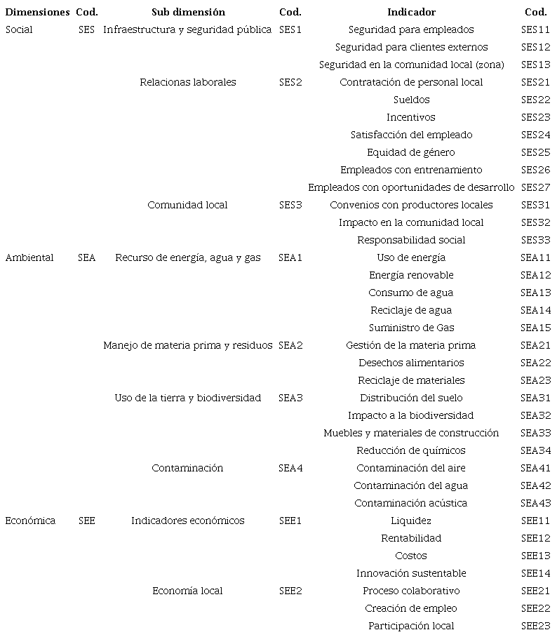 Para la delimitación de los indicadores clave, que forman parte de las dimensiones de sostenibilidad, se consideraron las categorías de sostenibilidad planteadas por Abad et al. (2017), Maynard et al. (2020))y Rajabi et al. (2022), las cuales se adaptaron al perfil de las empresas que conforman el sector de alimentos y bebidas (restaurantes, cafeterías, cáterin) y que pueden ser aplicables a otros modelos de negocios. Sobre esta perspectiva, este estudio contempló, tal como se observa en la Tabla 1, las siguientes dimensiones de evaluación con sus respectivos indicadores.