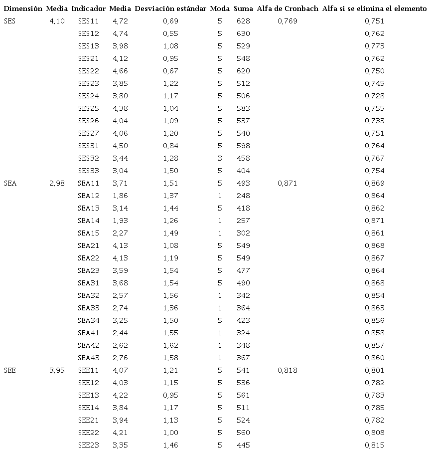 A partir de esta validez, mediante el AFE según el programa SPSS, se obtuvo, de los 21 indicadores con-templados en el nuevo modelo, una KMO de 0,839, una prueba de esfericidad de Barlett de 0,000, una varianza total explicada de 46,612, según el método de extracción de máxima verosimilitud, en el que el nuevo coeficiente de alfa de Cronbach, según este nuevo modelo de medida, fue de 0,7630 para la dimensión social (5 elementos), 0,864 para la ambiental (9 elementos) y de 0,818 para la variable económica (7 elementos). Por último, se obtuvo alfa general de 0,896.
