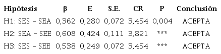 Para la prueba de hipótesis, se tomó en cuenta, en primer lugar, la asociación de las covarianzas existentes en el modelo de medida final según su correlación correspondiente. Para ello, tal como se observa en la Tabla 4, en función de los datos levantados y sistematizados, se acepta la relación existente entre las dimensiones social, ambiental y económica. Se concluye que estas dimensiones llegan a ser factores de correlación aceptable para el desarrollo sostenible en el ámbito gastronómico. Cabe señalar que, para esta valoración, se toman en cuenta los umbrales y las cargas formuladas por Calvo (2017), tanto para las correlaciones (carga factorial estimada) como para los valores críticos y de nivel de significancia. Según este autor, tanto el coeficiente de correlación (β) como la covarianza (E) deben ser mayores a 0 y de preferencia superiores a 0,5; el ratio crítico (CR) debe alcanzar un valor superior a 1,96, y el p-valor debe ser menor a 0,05 para considerarse significativas.