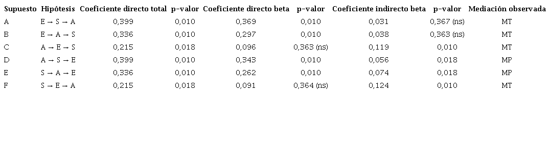 A tales efectos, como se puede observar en la Tabla 5, en función a los seis supuestos considerados para este estudio, existe la presencia de p-valores que alcanzaron cifras significativas inferiores a 0,05, tanto en los coeficientes directos como en los indirectos. Por consiguiente, existen cuatro supuestos casos (a, b, c y f) que generaron una mediación total y dos supuestos (d y e) que generaron una mediación parcial. Sobre estas mediaciones se puede observar que la dimensión económica no genera una incidencia directa y significativa entre las variables predictoras y de criterio.