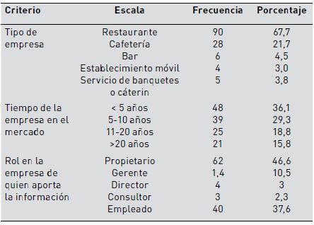 Para este estudio se consideró levantar la información de un perfil de empresas gastronómicas que se dedican a la venta de alimentos y bebidas ubicadas en la ciudad de Quito, Ecuador. Los restaurantes y las cafeterías son las empresas que más se destacan como modelos de negocio. Si bien, de acuerdo con la base de datos que se encuentra en el catastro nacional que maneja el Ministerio de Turismo del Ecuador, en Quito existe un total de 3643 establecimientos (Ministerio de Turismo, 2023), para esta investigación se consideró trabajar a partir de un muestreo por conveniencia. Se seleccionó esta técnica de muestreo no probabilístico y no aleatorio por la facilidad de acceso que se tiene a la información y la disponibilidad de los responsables de este tipo de empresas de formar parte de este estudio. Finalmente se logró levantar la información de 133 empresas.