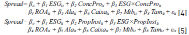 Os achados da relação entre o bid-ask spread, ESG e concentração de propriedade, corroboram com os anteriores. O primeiro e o segundo testes demonstram que a divulgação ESG é negativa e significativa a 5% e 10% respectivamente; tanto quando a concentração de propriedade é maior que 50%, como quando é menor. Com relação à concentração de propriedade, a variável foi significativa e negativa a 5% somente quando a concentração é maior ou igual a 50%, assim como a variável de interação (ESGxConcPro), positiva e significativa a 5%. Quando a concentração é menor que 50%, ambas as variáveis deixam de ser significativas.