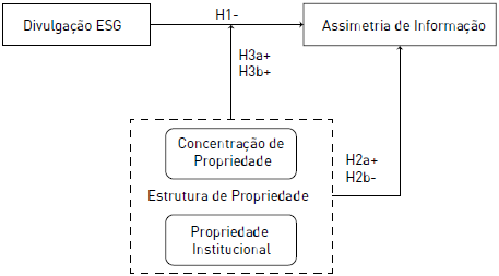 H3a: A concentração de propriedade corporativa modera positivamente a relação entre a divulgação ESG e a assimetria de informação. H3b: A propriedade institucional corporativa modera positivamente a relação entre a divulgação ESG e a assimetria de informação.