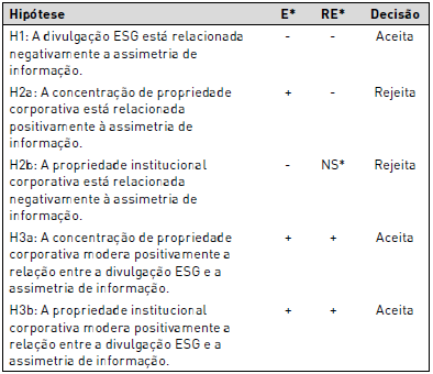 Com relação às hipóteses, inicialmente buscou-se identificar a relação entre divulgação ESG e assimetria de informação, conforme os resultados apresentados na Tabela 3.