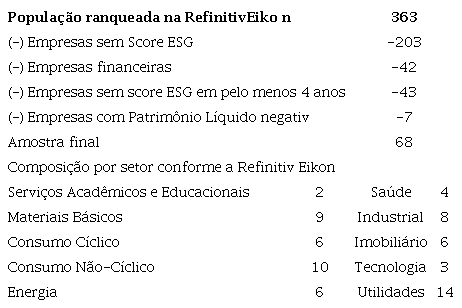 A população compreendeu 363 empresas de diferentes setores, listadas na B3, que estavam ranqueadas na Refinitiv Eikon por meio do ESG Score. Para o período entre 2015 a 2022, a amostra foi composta por 68 companhias e um máximo de 512 observações em um painel não-balanceado. A composição da amostra se deu a partir das empresas que divulgaram informações ESG necessárias para o desenvolvimento da pesquisa e pode ser visualizada na Tabela 1.