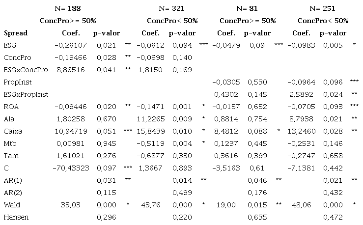 Os resultados da relação entre o bid-ask spread, ESG e propriedade institucional também são consistentes com os achados anteriores. A divulgação ESG é negativa e significativa independentemente do nível de concentração de propriedade. Os resultados demonstram, ainda, que a propriedade institucional somente exerce efeito sobre o bid-ask spread quando a concentração de propriedade é menor que 50%, apresentando relação negativa e significativa a 10%. Além disso, a interação entre ESG e propriedade institucional (ESGxPropInst) somente é significativa e positiva ao nível de 5%, quando a concentração de propriedade é menor que 50%.
