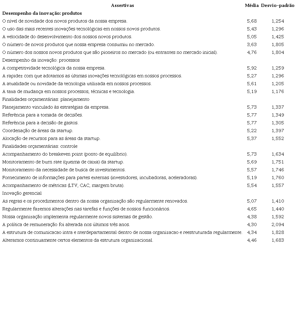 No que se refere à inovação gerencial, observa-se que a média acima de 4,53 está associada a regras e procedimentos que são regularmente renovados dentro da maioria das startups da amostra. Esse resultado indica que as startups adotam uma postura adaptativa e inovadora na gestão, que pode contribuir para a eficiência operacional e fortalecer a capacidade das startups de lidar com o dinamismo ambiental em que estão inseridas (Frare et al., 2022). Portanto, apreende-se que as startups da amostra priorizam os três tipos de inovação (de produtos, de processos e gerencial] e utilizam o orçamento para a manutenção e direcionamento dos recursos financeiros para alcançar a competividade e agregação de valor de mercado.