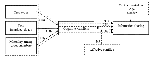 The theoretical model predicts a direct relationship among task types (H1a), task interdependence (H1b), and mutuality among group members (H1c) in cognitive conflicts. H2 assumes a direct relationship between cognitive conflicts and information sharing, while H3 conjectures moderation of affective conflicts in this relationship. The model also predicts indirect relationships through cognitive conflicts among task types (H4a), task interdependence (H4b), and mutuality among group members (H4c) in information sharing. In addition, it includes control variables.
