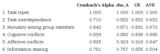 Data analysis began with a factor analysis of the research instrument to verify relationships and common factors of the constructs (Hair et al., 2017). In this analysis, one item of the task interdependence construct, two of the cognitive conflicts construct, and one of the information sharing construct were removed from the model because they do not meet the criterion proposed by Hair et al. (2017) of obtaining factor loads greater than 0.70 for each item. Subsequently, descriptive analyses were performed to assess the distribution of quantitative variable responses.
