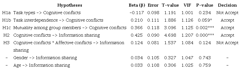 The Variance Inflation Factor (VIF) values to identify multicollinearity issues were observed in addition to the path coefficients. The VIF values presented by the research constructs varied between 1.001 and 1.207, which suggests the absence of multicollinearity (Hair et al., 2017). The variance explained (R2) presented significant explanatory power of cognitive conflicts and information sharing constructs. Values greater than zero were found when determining the constructs' predictive relevance (Q2) (Hair et al., 2017).