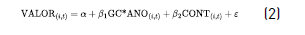 A relação entre qualidade do sistema interno de governança corporativa e valor das empresas brasileiras durante a pandemia da covid-19 foi investigada por meio dos modelos indicados nas Equações 2 e 3, em que: i e t, respectivamente, representam a empresa e o ano da observação; VALORi,t o valor da empresa i no período t; GGjt são variáveis indicativas da qualidade do sistema interno de governança corporativa da empresa i no período t; ANO são variáveis binárias indicativas do período pandêmico (2020, 2021 e 2022); GC*ANOit é variável interativa da qualidade do sistema interno de governança corporativa da empresa i no período t com o ano da observação; CONTjt são as variáveis de controle associadas à empresa i no período t; a é o intercepto; ß1, ß2, ß3 e ß4 são os coeficientes das variáveis explicativas; e Є é o termo de erro. Na Equação 2, é feita análise do efeito anual de cada variável de governança corporativa sobre o valor da empresa (ß1). Na Equação 3, por sua vez, o objetivo é verificar o efeito moderador do ano da observação sobre a relação entre governança corporativa e valor da empresa (ß3).