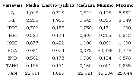O valor da empresa (Valor) foi operacionalizado pelo Q de Tobin (Q) e pelo índice market-to-book (MB), a fim de dar mais robustez aos resultados. O Q de Tobin foi mensurado pela razão entre o enterprise value e o ativo total. O índice MB foi calculado pela razão entre o valor de mercado das ações e o valor contábil do patrimônio líquido da empresa. Os dados utilizados para a operacionalização do Q de Tobin e do MB foram extraídos da base de dados Economática®. O enterprise value contempla, além do valor de mercado das ações da empresa, a dívida total líquida e a participação dos acionistas minoritários. O valor de mercado das ações corresponde ao preço de fechamento anual de cada tipo de ação da empresa multiplicado pelo número de ações emitidas. O ativo total e o patrimônio líquido foram extraídos das demonstrações contábeis padronizadas.