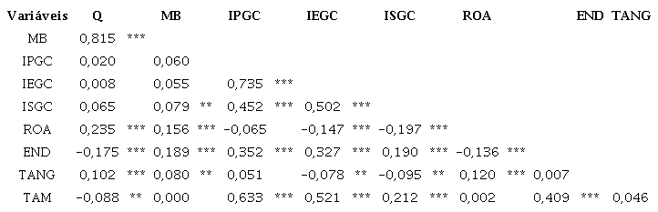 Na Tabela 2, é apresentada a matriz de correlação entre as principais variáveis métricas utilizadas no estudo. Observa-se que há correlação elevada entre as métricas de valor (Q e MB), bem como entre as variáveis de governança corporativa (IPGC, IEGC e ISGC), o que indica consistência entre as métricas utilizadas. Entretanto, não se verificou correlação positiva consistente entre valor e governança corporativa, conforme preconizado pela literatura.
