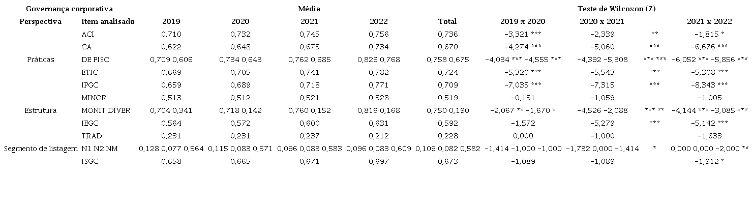 A fim de se analisarem as mudanças ocorridas no sistema interno de governança corporativa durante a pandemia, foi feita análise comparativa ano a ano das médias das dimensões de adoção de práticas, das características da estrutura e do segmento de listagem de governança corporativa considerando os quatro anos amostrados (2019, 2020, 2021 e 2022). Uma vez que a maior parte das variáveis analisadas não apresentou distribuição normal, optou-se por utilizar teste de diferenças de média não paramétrico para duas amostras emparelhadas (Wilcoxon). A estatística Z reportada pelo teste de Wilcoxon indica o valor padronizado da média dos postos das diferenças entre os valores das variáveis governança corporativa de cada empresa considerando dois anos consecutivos (ano t0-ano t1). Nesse sentido, uma estatística Z negativa indica que, no ano t1, os valores médios das variáveis são superiores aos valores médios do ano t0 (crescimento da qualidade da governança corporativa), enquanto uma estatística Z positiva indica o contrário (redução da qualidade da governança corporativa).