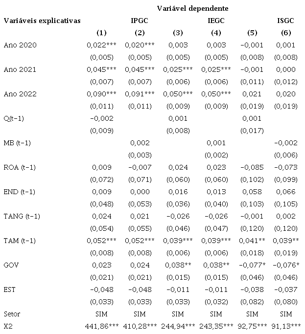 Na Tabela 4, são apresentadas as estimações em que se analisou a relação entre índices de qualidade do sistema interno de governança corporativa e período pandêmico. Quando analisada a adoção de práticas de governança corporativa, observa-se relação positiva do índice com os três anos da pandemia (estimações 1 e 2). O índice que mede a qualidade da estrutura de governança corporativa apresentou relação positiva apenas com os anos de 2021 e 2022 (estimações 3 e 4). Já o índice de segmentos de governança corporativa da B3 não apresentou relação estatisticamente significante com o período pandêmico (estimações 5 e 6). Esses achados, em conjunto com os resultados dos testes de Wilcoxon (Tabela 3), indicam que houve mudanças positivas no sistema interno de governança corporativa das empresas brasileiras durante os três anos da pandemia, corroborando a primeira hipótese de pesquisa.