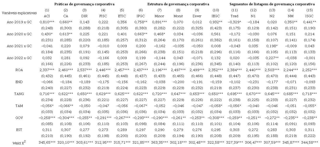 Como teste de robustez, foram processadas estimações em que se analisou o efeito moderador do período pandêmico sobre a relação entre qualidade do sistema interno de governança corporativa e valor das empresas brasileiras, tendo como base o ano de 2019. Os resultados, apresentados na Tabela 8, corroboram os achados das Tabelas 6 e 7. A interação dos três índices de governança corporativa com o primeiro ano da pandemia (governança corporativa x ano 2020) não apresentam significância estatística, o que sugere que, no primeiro ano da pandemia, a qualidade do sistema interno de governança corporativa continuou apresentando relação positiva com o valor das empresas brasileiras. Nos dois anos seguintes, entretanto, pode-se verificar efeito moderador negativo: a interação do ano de 2021 com os três índices de governança corporativa apresentou relação negativa e significante com o valor da empresa (governança corporativa x ano 2021); em 2022, essa relação permaneceu negativa e significante para os índices de estrutura e de segmento de listagem de governança corporativa. Esses achados indicam que, nos anos de 2021 e 2022, a qualidade superior do sistema interno de governança corporativa apresentou relação mais fraca com o valor das empresas do que em 2019, conforme já havia sido constatado anteriormente (Tabelas 6 e 7).
