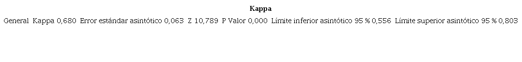 Los resultados son analizados en conjunto mediante el análisis del índice de kappa de Fleiss que se presenta en la Tabla 4. Para el uso del software IBM® SPSS se reemplazaron las variables categóricas por numéricas: 0 para no y 1 para sí.