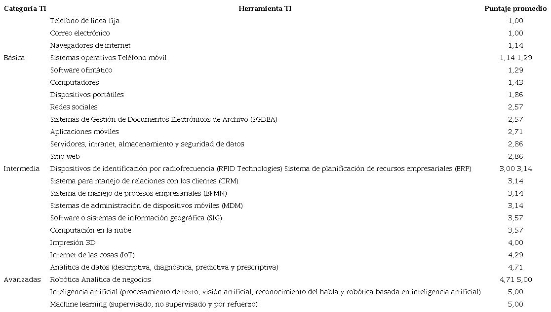En la Tabla 7 se presenta el promedio de las evaluaciones de los expertos clasificadas según los siguientes rangos: TI básica: 1-2,33; TI intermedia: 2,34-3,66 y TI avanzada 3,67 y 5.