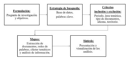 En la metodología aplicada se siguió la técnica de sistema de mapeo científico (systematic mapping research, SMR), entendida como un proceso que identifica, categoriza y analiza la literatura existente de un tema en particular (Li et al., 2015; Salama et al., 2017). Involucra herramientas de cienciometría e indicadores que explican la evolución hermenéutica, como también las tendencias y patrones relacionados con el concepto en el área del conocimiento (Noyons et al., 1999; Chen, 2017; López et al., 2023).