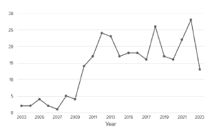 Los resultados que se exponen en este apartado se obtuvieron a partir de un mapeo sistemático en el que se rastrearon 297 documentos identificados en la base de datos Scopus. Como se mencionó entonces en el marco teórico, la publicación del primer modelo impulsó significativamente los estudios sobre HF en el CI, tal como se ilustra en la Figura 2. Se observa que los años con mayor número de publicaciones fueron 2011, 2018 y 2022. Este patrón sugiere que la HF continúa siendo relevante y activa en la investigación actual.