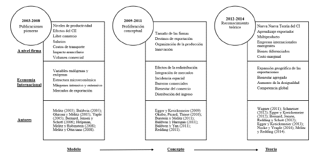 Esta sección parte de la comprensión de que el origen de la HF radicó en el modelo original de Melitz (2003) y en los ajustes y contribuciones de los autores pioneros en los cinco primeros años (2003-2008). La aceptación de la comunidad científica se evidenció cuando hubo una importante proliferación de estudios que abordaron la HF como concepto después del 2009. Luego se convirtió en la NNTCI, lo que aquí se denomina salto a la teoría, específicamente en el 2012, y finaliza con temas abordados en los últimos diez años respecto a la HF, después del 2014 (Figura 3).