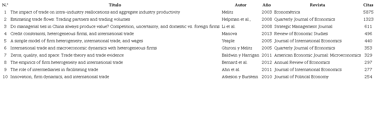 Entre los autores y documentos más citados en el campo de estudio se encuentra Melitz, cuyas contribuciones suman hasta la fecha más de 13 500 citas en Scopus y más de 50 000 en Google Scholar. Su modelo del 2003 sigue inspirando investigaciones como esta, con 6421 citas en Scopus, y superando las 20 000 en Google Scholar. Otros referentes clave para el avance científico en esta área incluyen a Baldwin, Yeaple, Bernard, Jensen, Redding y Schott, así como Wagner, y los nuevos autores que siguen aportando a repensar las dinámicas actuales de la heterogeneidad de las firmas.. Además, se resalta el legado fundamental e ineludible de Krugman, en la comprensión de las dinámicas actuales del comercio internacional y los avances hacia la competitividad.