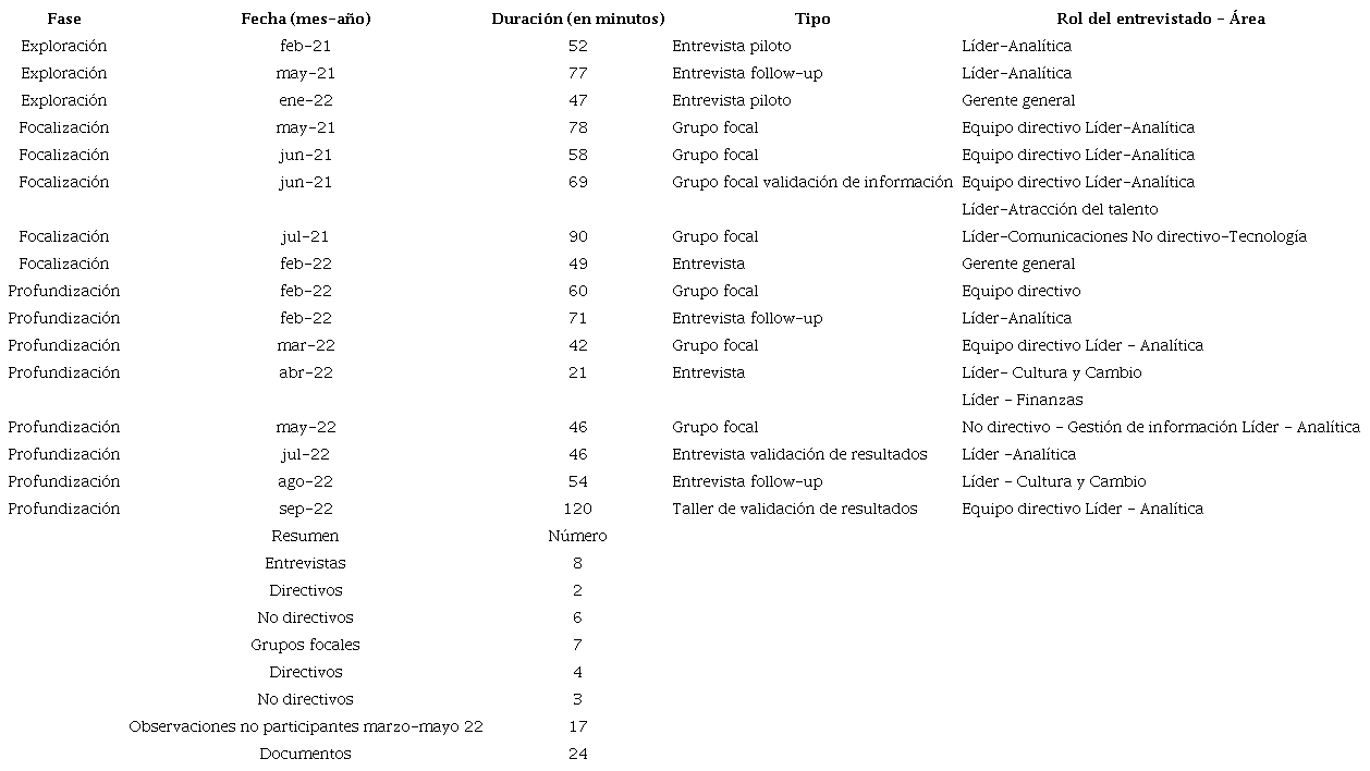 Los siete grupos focales y las ocho entrevistas semiestructuradas (Roulston, 2010) se realizaron de manera virtual y contaron con la participación de los equipos directivos, mandos medios y bajos de las organizaciones (practicantes) con el objetivo de conocer la experiencia y percepción de los diferentes perfiles en las prácticas de inclusión. Para definir las personas que participaban de estos espacios, se acudió al muestreo por bola de nieve (Patton, 2015). Finalmente, se llevó a cabo un total de diecisiete observaciones no participantes (Merriam y Tisdell, 2016), en espacios de comités directivos y comités de área en los que se daban conversaciones relacionadas con estrategia y espacios sugeridos por los practicantes según el objeto del estudio. Cabe resaltar que la recolección de datos fue realizada por tres investigadoras, casi siempre de forma simultánea.