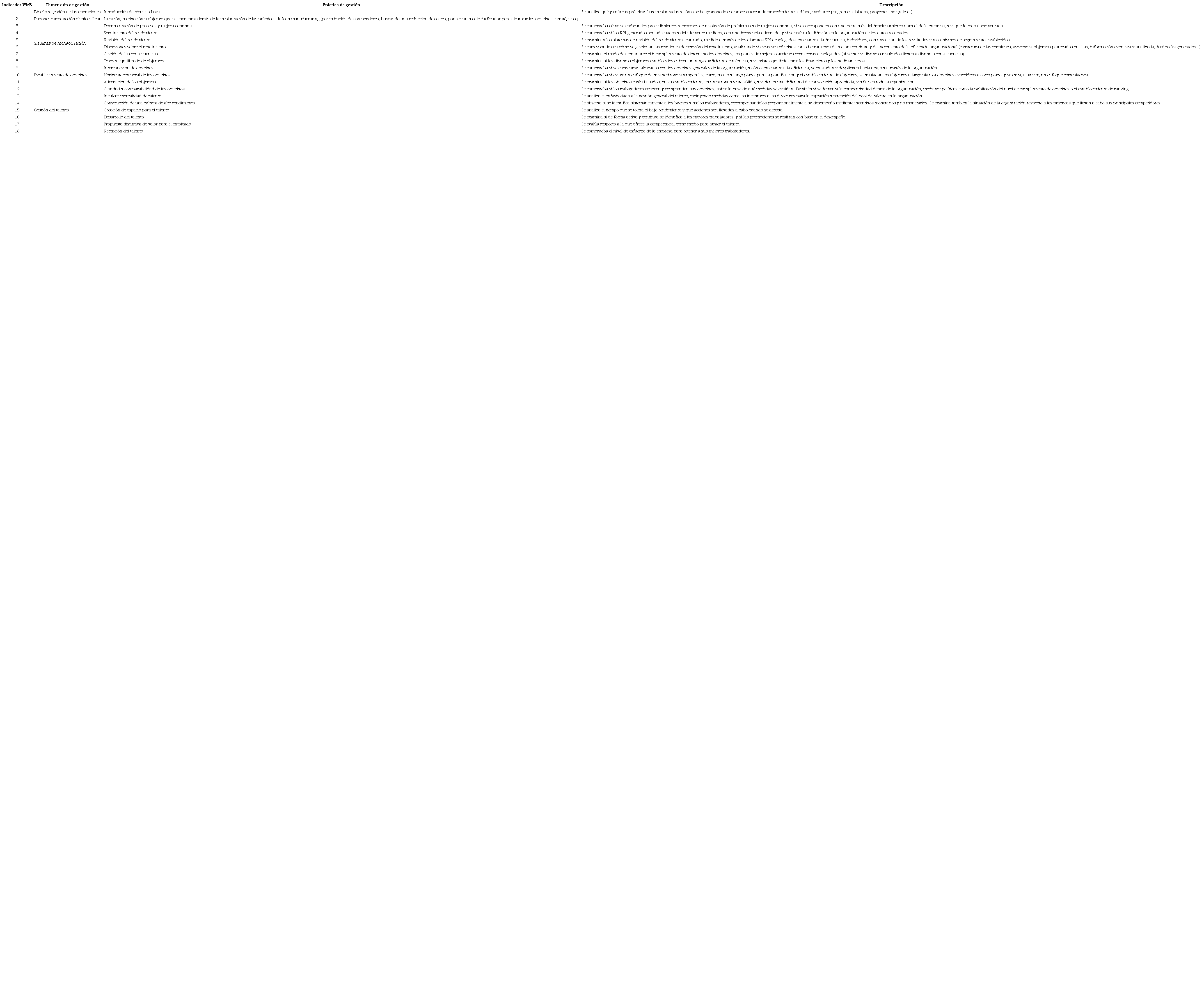 La herramienta del WMS cuantifica la CG de las empresas a través de la evaluación de un conjunto de 18 prácticas (recogidas en la Tabla A1) pertenecientes a cuatro aspectos de la gestión de las organizaciones: 1) diseño y gestión de las operaciones, 2) sistemas de monitorización, 3) establecimiento de objetivos y 4) gestión del talento. Las 18 prácticas que conforman estas cuatro dimensiones del management son similares a las incluidas en trabajos previos en prácticas de gestión, como los de Ichinowski et al. (1997) y Black y Lynch (2001), y se basan en el enfoque management as technology (MAT). Según este modelo, existen determinadas prácticas de gestión que son siempre buenas para el logro de un mayor performance (Bloom et al., 2016b; Scur et al., 2024). Ejemplos de estas prácticas son la introducción de técnicas lean manufacturing, la recolección y el uso de key performance indicators, la meritocracia en la gestión de los recursos humanos o la fijación de objetivos motivantes para los trabajadores (Bloom y Van Reenen, 2010; Bloom et al., 2010c). Otras prácticas de gestión quedan excluidas por no haberse establecido que su desarrollo en las organizaciones genere un efecto positivo sobre su performance; prácticas que se corresponderían con la perspectiva de diseño del management (Dessein y Prat, 2022). Ejemplos de estas prácticas son determinadas estrategias de marketing, las decisiones de entrada en nuevos mercados o de abandono de actuales, las fusiones y adquisiciones, entre otras (Bloom y Van Reenen, 2007). No obstante, recientemente se ha propuesto la utilidad de los datos generados por el WMS para la investigación empírica, la theory-building y el contraste en el ámbito de la estrategia empresarial (Scur y Wolfolds, 2023).