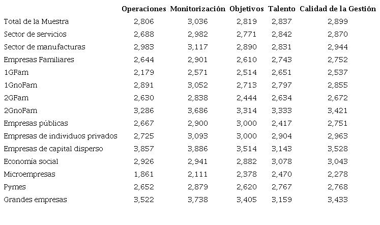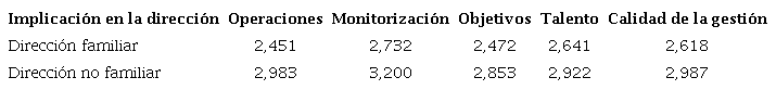 Las empresas con gestión familiar presentan puntuaciones promedio sensiblemente inferiores, tanto en CG como en cada uno de los grupos de prácticas considerados. El mayor salto se tiene en el diseño y gestión de las operaciones, con 0,532 puntos; y el menor, en la gestión del talento, con 0,281 puntos. Así, la mayor diferencia se tendría en el grupo de prácticas con un perfil más técnico, como la implementación de herramientas y métodos lean, y las menores en aquellas más generalistas, como no renovar a los peores trabajadores y promocionar a los mejores (Bloom y Van Reenen, 2007).
