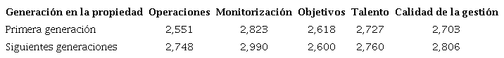 Respecto a la generación de la familia en la propiedad de la empresa, a partir de su fundación, se dividen las empresas familiares en dos grupos: las de primera generación y las de siguientes generaciones. Los resultados, tal y como se recogen en la Tabla 3, muestran que el segundo grupo presenta una mejor calidad de sus prácticas de gestión en todas las categorías consideradas, excepto en el establecimiento de los objetivos, con una leve diferencia de 0,018 puntos a favor de las empresas de primera generación. En todo caso, las diferencias (0,103 puntos en CG) son sensiblemente inferiores a las obtenidas en el caso anterior.