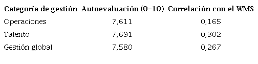 Las puntuaciones de autoevaluación tienen una muy baja correlación con las del WMS. Es más, si los 7,580 puntos de autoevaluación de gestión global se trasladan a la escala de 1 a 5 del WMS supondrían 4,032 puntos, muy por encima de los 2,899 puntos de la nota promedio global de CG. En el caso de la autoevaluación en gestión del talento, la nota correspondiente del WMS sería de 4,076 puntos, y de 4,044 puntos para el diseño y gestión de las operaciones. Muy alejadas, en todo caso, de las puntuaciones obtenidas en dichas categorías en el WMS, respectivamente, 2,837 y 2,806 puntos.