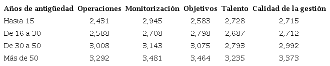 Los resultados obtenidos al segmentar las empresas por su antigüedad se recogen en la Tabla 6. Tanto la puntuación en CG como la de las distintas categorías de gestión aumenta conforme lo hace la antigüedad de la empresa, aunque este incremento no es sostenido. En concreto, si bien el salto entre el grupo de empresas más jóvenes y el más antiguo es de 0,658 puntos en CG, cuando se pasa desde el grupo de empresas de hasta 15 años al de empresas entre 16 y 30 años de vida la puntuación global se mantiene prácticamente constante, e incluso decrece para los casos de gestión del talento y de sistemas de monitorización.