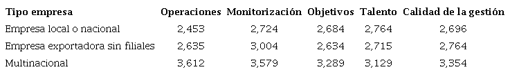 La presencia internacional de la empresa es otro aspecto analizado por el WMS, en cuanto a su relación con la calidad de las prácticas de gestión. Considerando tres niveles de internacionalización -empresa puramente local o nacional, empresa exportadora sin filiales en el extranjero y empresa multinacional (con filiales en el extranjero)-, los resultados obtenidos por las empresas de la muestra se presentan en la Tabla 7.