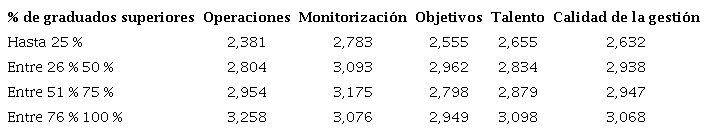 Al aumentar la ratio de empleados con título universitario aumentan, a nivel general, las puntuaciones promedio obtenidas, aunque se aprecian algunos retrocesos al pasar del segundo al tercer cuartil. El mayor incremento se produce entre el primer y el segundo cuartil (de 0,306 puntos), mientras que entre el primero y el último cuartil el salto es de 0,436 puntos.