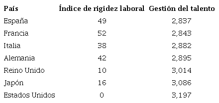 Los tres países con menor rigidez presentan también las mayores puntuaciones en gestión del talento. En concreto, Estados Unidos, con un índice de rigidez laboral 0, tiene la mayor puntuación en gestión del talento, con 3,197 puntos. En contraposición, los países con mayor rigidez laboral, España y Francia, presentan las menores puntuaciones de gestión del talento, a 0,360 y 0,354 puntos, respectivamente, de Estados Unidos.