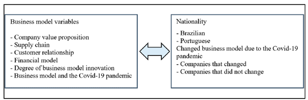 This study employed a quantitative approach and descriptive nature and was conducted using a survey. For Marconi and Lakatos (2021, p. 89), quantitative descriptive research consists of investigations "whose main purpose is to delineate or analyze the characteristics of facts or phenomena, the evaluation of programs, or the isolation of main or key variables." Therefore, this study sought to contribute to inferences regarding the differences in sustainability-oriented business models from Brazilian and Portuguese industrial companies due to the COVID-19 pandemic. The research instrument was validated by experts (research professors) in innovation and sustainability. The conceptual model is defined from the variables of the sustainability-oriented business model, nationality, and changes resulting from the pandemic (Figure 1).