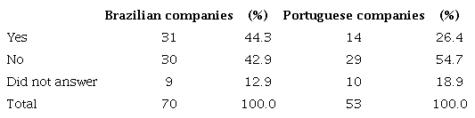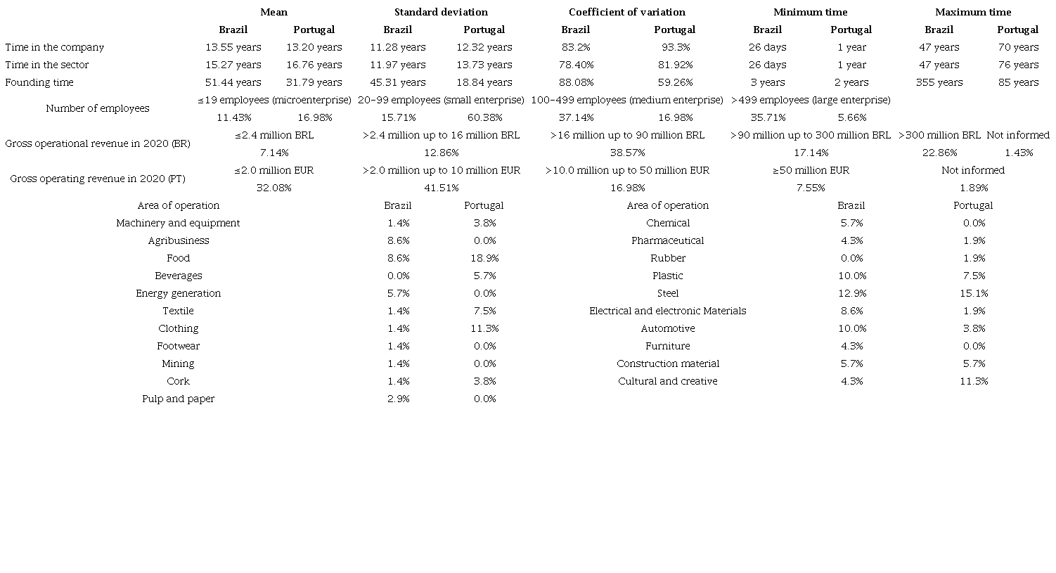 The mean founding time of the Brazilian companies analyzed is 51 years, the oldest organization being 355 years old and the youngest 3 years old. Among the Portuguese companies, the oldest organization is 85 years old and the youngest is 2 years old. The considerable variability in relation to the time of existence of the companies suggests the existence of traditional and conservative perceptions on the part of the older ones and more modern and entrepreneurial conceptions of the newer organizations.