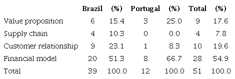 The data in Table 3 shows a higher proportion of Brazilian companies (44.3%) that have undergone changes in their business model compared to the Portuguese companies (26.4%). Table 4 lists the business model elements of the companies investigated that have undergone the most changes due to the COVID-19 pandemic.