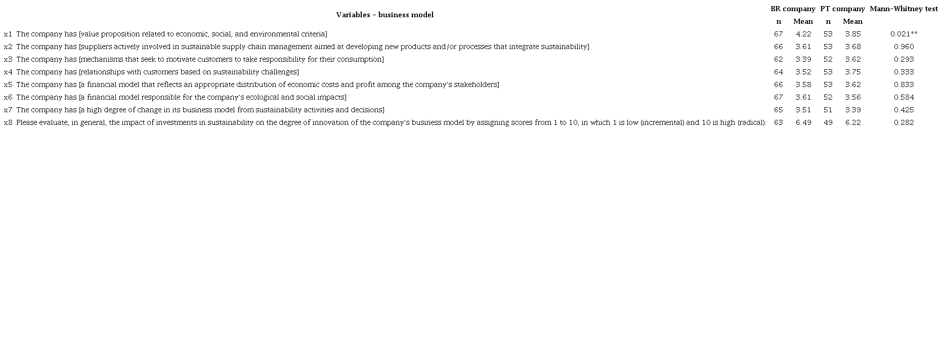 By comparing the business model elements between the two categories, the Mann-Whitney test proved to be significant for two of the six variables analyzed. Thus, from the results of the test, it is possible to conclude that there is a difference between the companies in relation to the company's value proposition being related to economic, social, and environmental criteria and in the mechanisms that seek to motivate customers to assume their responsibilities for consumption.