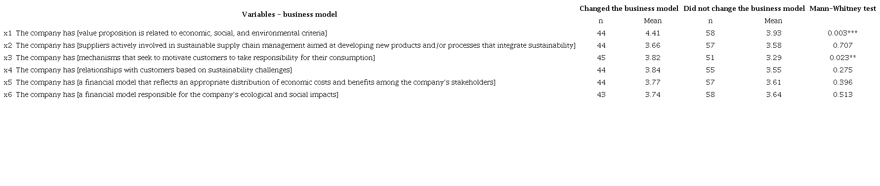 By comparing the business model elements according to nationality, the Mann-Whitney test proved to be significant for one of the eight variables analyzed. Thus, from the test results, one can conclude that there is a difference in the company's value proposition related to economic, social, and environmental criteria according to nationality, so Brazilian companies have a higher mean when it comes to this aspect. Although the two groups refer to companies from countries at different stages of development, it should be noted that regarding the number of employees, most of the surveyed Brazilian companies are classified as medium and large companies; this contrasts with the Portuguese companies, most of which are classified as small companies. Table 6 lists the variables corresponding to the business model according to the criterion corresponding to whether or not there was a change in the business model due to COVID-19.