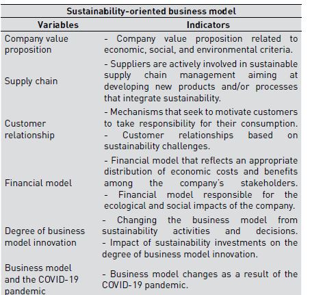 The analyzed variables were grouped into the sustainability-oriented business model dimension and were based on Boons and Lüdeke-Freund (2013), Kiron et al. (2013), and Taran, Boer, and Lindgren (2015). As shown in Figure 1, the variables refer to company value proposition, supply chain, customer relationship, financial model, degree of business model innovation, and business model and COVID-19 pandemic. The characteristics of each variable are listed in Table 1.