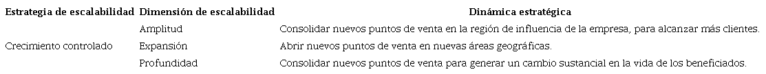 El autor Islam (2022) encontró que este tipo es conveniente cuando la empresa desea garantizar que los procedimientos se hagan de determinada manera, sin poner en riesgo la calidad, como podría pasar si la ejecución queda en manos de otras organizaciones, y cuando se desea proteger los métodos y el know-how. En la Tabla 2 se presenta la estrategia de crecimiento controlado junto a sus tres dimensiones, lo que permite obtener las dinámicas estratégicas de escalabilidad de impacto social para este planteamiento específico.