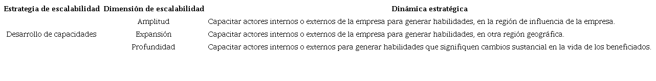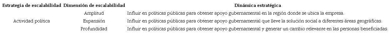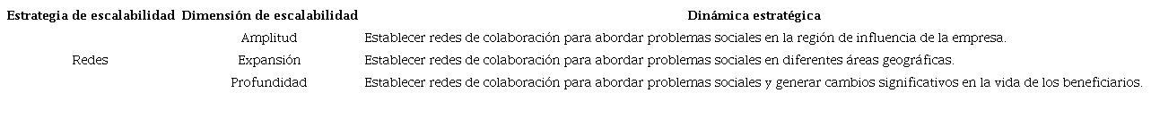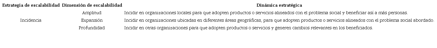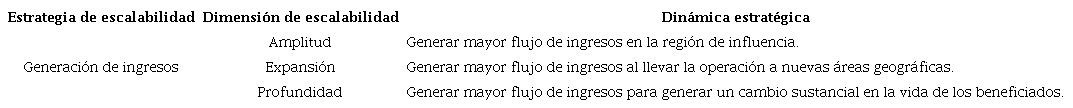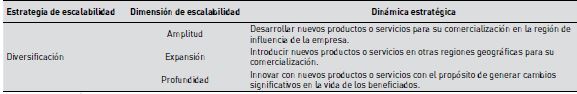 En la Tabla 1 se presenta la estrategia de diversificación junto a sus tres dimensiones, lo que permite obtener las dinámicas estratégicas de escalabilidad de impacto social correspondientes.