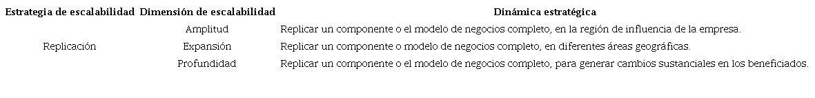 A partir de un modelo base, la replicación involucra, primero, el reconocimiento de las especificaciones mínimas de éxito (Dobson et al., 2018); segundo, procesos estandarizados (Cwiklicki, 2019); y, tercero, implica dejar un margen para la adaptación a las características del nuevo contexto (Jha et al., 2021). La Tabla 9 enseña la estrategia de replicación con las tres dimensiones, lo que conlleva consolidar las respectivas dinámicas estratégicas de escalabilidad de impacto social.