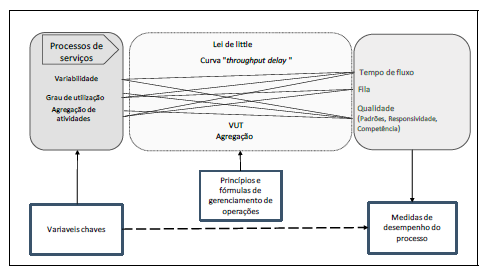 O experimento buscou investigar três medidas de desempenho dos processos internos que podem efetivamente aprimorar o fluxo de processos em suas principais dimensões: tempo de fluxo, taxa de fluxo e estoque. Essas medidas exercem um impacto direto sobre o custo e o tempo de resposta, sendo influenciadas pela flexibilidade e qualidade do processo (Jacobs e Chase, 2012; Krajewski, 2007; Reid e Sanders, 2005; Slack et al., 2013; Stevenson, 2014). A compreensão dessas medidas é fundamental para os profissionais de gerenciamento de operações. Elas são orientadas por princípios e fórmulas, como a Lei de Little, e são afetadas por variáveis como a utilização da capacidade e a variabilidade do processo. A Figura 1 apresenta a relação entre as variáveis discutidas no texto, evidenciando forte conexão entre as variáveis-chave, os princípios e as fórmulas da Gestão de Operações e as medidas de desempenho. Em particular, observa-se que a variabilidade na duração das atividades e a forma como estas são designadas aos operadores (agrupadas ou desagregadas) influenciam diretamente o desempenho de processos de serviço. Conforme estabelece a Lei de Little, o tempo médio de permanência de uma unidade de fluxo no sistema (tempo de fluxo) é proporcional ao número médio de unidades de fluxo no sistema (tamanho da fila) e inversamente proporcional à taxa fluxo. Complementarmente, a Equação de VUT - que relaciona variabilidade (V), utilização do sistema (U) e tempo de espera (T) - indica que aumentos na variabilidade das atividades e na utilização dos recursos tendem a ampliar o tempo de espera e o tamanho das filas. Essa lógica é reforçada pela curva Throughput-delay, que descreve o comportamento não linear entre a taxa de utilização do sistema e o tempo médio de resposta. A curva mostra que, à medida que a utilização se aproxima da capacidade máxima do sistema, pequenas variações na taxa de ocupação dos recursos ou na variabilidade das atividades provocam aumentos desproporcionais nos tempos de espera. Dessa forma, maior variabilidade na duração das tarefas pode gerar maior instabilidade no fluxo, impactando negativamente o tempo de resposta do sistema e, consequentemente, a percepção de qualidade e a satisfação do cliente (Anupindi et al., 2011).