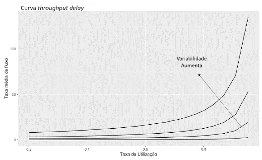 Na Figura 2, há um gráfico chamado "curva throughput delay", que mostra o tempo médio que uma tarefa leva para ser concluída com base na capacidade que está sendo utilizada. O gráfico também mostra que o tempo médio aumenta significativamente quando há alta utilização da capacidade e variabilidade (Anupindi et al., 2011).