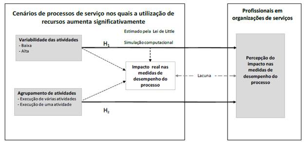 A Figura 3 ilustra as duas hipóteses trabalhadas no texto relacionadas à percepção do impacto nas medidas de desempenho de um processo de serviço, em cenários caracterizados por um aumento substancial no grau de utilização dos recursos.