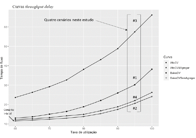 A construção desses dois modelos permitiu a elaboração de quatro curvas throughput delay (Figura 4). Esse gráfico aponta os quatro cenários usados neste trabalho, obtidos com os fatores A e B descritos na Tabela 1.